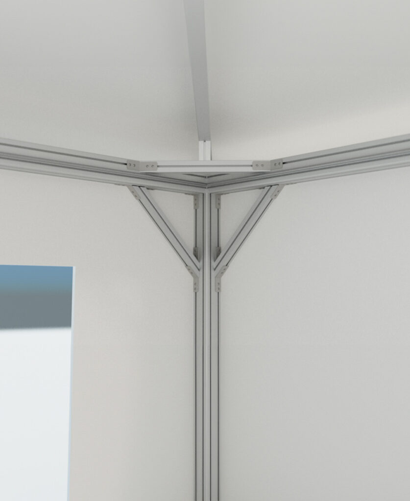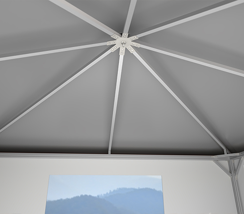 Der Pavillon aus dem Hause MTH ist besonders flexibel in der Anordnung der Seitenwände und äußerst robust dank Aluminiumprofilen mit einer Stärke von bis zu 80 x 80 mm. Dank des Firstknotens, der bis zu 8 Dachträger aufnehmen kann und dem bewährten MTH Doppelkederschienen-System aus pulverbeschichtetem Aluminium wird eine stets optimale Dachspannung garantiert.