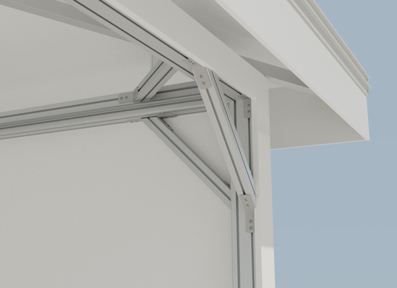 Dachträgern 4 Eckstützen aus 40 x 40 mm eloxiertem Aluminiumprofil mit Diagonalverstrebung und Dachplane - Profile Alu:
