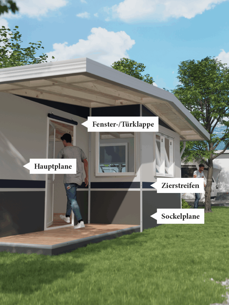 Bei MTH haben Sie unendlich viele Kombinationsmöglichkeiten: Gestalten Sie Ihr Vorzelt ganz nach Ihren Vorstellungen, indem Sie Hauptplane, Zierstreifen, Sockelplane und Fenster-/Türklappen individuell kombinieren